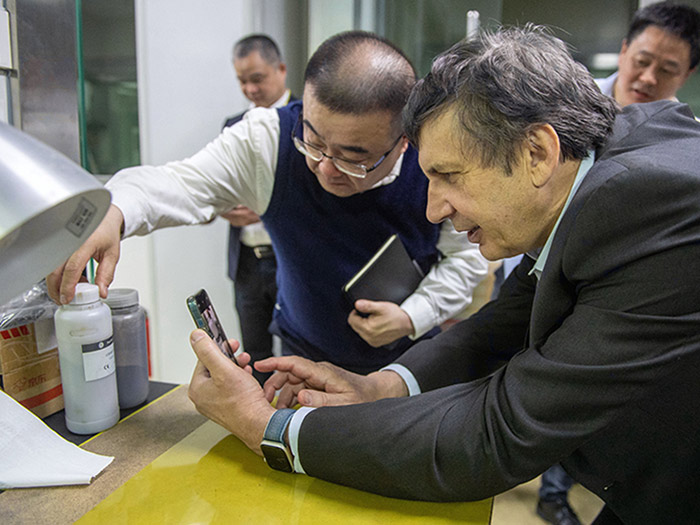 在科技中心,安德烈?海姆教授饒有興趣地參觀了超威科技項(xiàng)目研發(fā)實(shí)驗(yàn)室。當(dāng)看到石墨烯項(xiàng)目組研發(fā)人員正在進(jìn)行材料分析時(shí),他饒有興趣地拿起一瓶石墨烯材料仔細(xì)觀察,并與研發(fā)人員進(jìn)行相關(guān)技術(shù)問(wèn)題。
